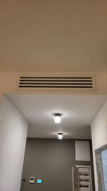 Всего один незаметный внутренний блок, спрятанный за подвесным потолком. На виду остаются только декоративные решётки, гармонично встроенные в интерьер.